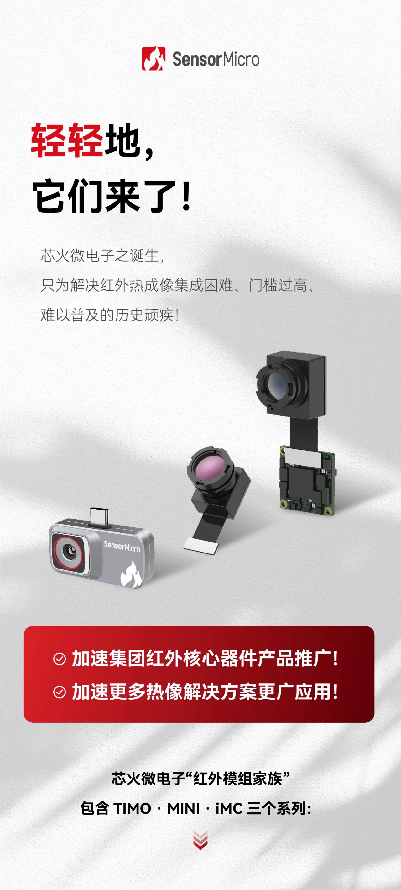 對(duì)于紅外熱成像, 每個(gè)人都有不同的期待: 期待更便捷的熱像使用體驗(yàn), 期待更精準(zhǔn)的紅外測(cè)溫應(yīng)用, 你的期待,即刻到來(lái)! 面向移動(dòng)終端的快速集成熱像方案 iMC微型紅外模組在芯火微電子正式發(fā)布!