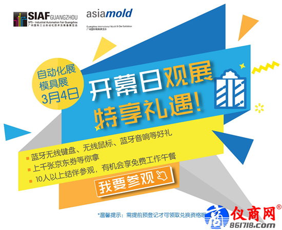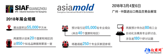 儀商訊:第十二屆廣州國(guó)際模具展覽會(huì)(Asiamold)將于2018年3月4-6日在廣州進(jìn)出口商品交易會(huì)展館隆重舉行,本屆展會(huì)將再次與SIAF廣州國(guó)際工業(yè)自動(dòng)化技術(shù)及裝備展覽會(huì)同期舉行,總專(zhuān)業(yè)觀眾人數(shù)達(dá)到65,000 名,吸引共850家展商,展覽面積占55,000平方米。
