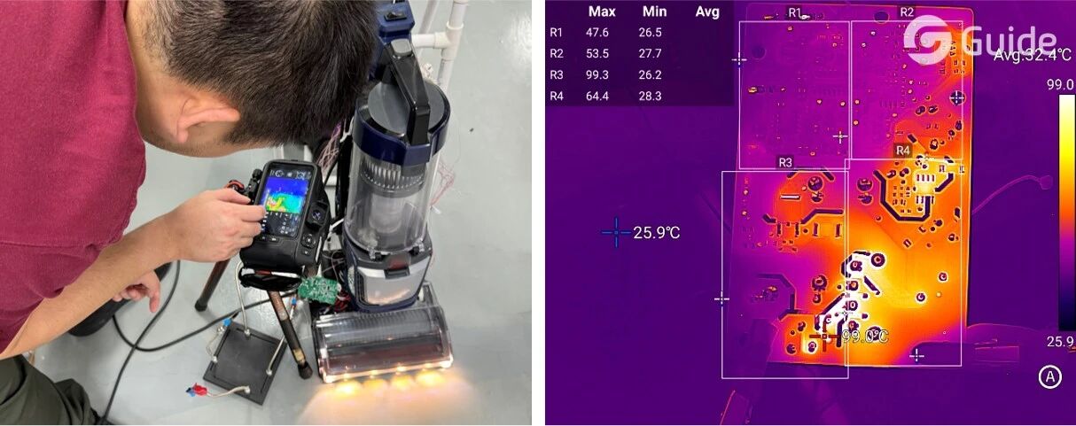 某知名智能家電企業(yè),是一家擁有百年歷史的家居清潔品牌。在其新一代洗地機的研發(fā)過程中,團隊需要精準評估主控板(PCBA)在不同清洗模式下的發(fā)熱和散熱表現(xiàn),從而為產(chǎn)品設計定型、運行穩(wěn)定性提升及能耗優(yōu)化提供可靠的數(shù)據(jù)支撐。該企業(yè)對多家廠商的熱像儀進行對比測試后,最終選擇高德智感PT系列紅外熱像儀,并搭配專用微距鏡頭,將其應用于洗地機新品的研發(fā)與品控環(huán)節(jié)。