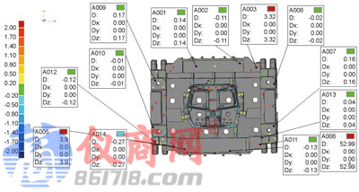 下面以天遠(yuǎn)三維攝影測量系統(tǒng)DigiMetric在大型鋼模3D檢測中的應(yīng)用為例進(jìn)行流程介紹:此案例需要對產(chǎn)品的部分型面進(jìn)行對比,因此在3D攝影測量的基礎(chǔ)上,還需要配合3D掃描儀進(jìn)行精細(xì)掃描,獲取型面的點云數(shù)據(jù)。首先采用天遠(yuǎn)三維攝影測量系統(tǒng)DigiMetric獲得所有標(biāo)志點的3D坐標(biāo),以此標(biāo)志點3D坐標(biāo)數(shù)據(jù)為框架,用天遠(yuǎn)三維掃描儀OKIO系列產(chǎn)品進(jìn)行型面的精細(xì)3D掃描,從而得到型面的點云數(shù)據(jù)和標(biāo)志點框架數(shù)據(jù)。然后導(dǎo)入產(chǎn)品的CAD 模型數(shù)據(jù),并進(jìn)行3D對比(圖2、3),可以對比型面數(shù)據(jù),亦可比對關(guān)鍵點坐標(biāo)數(shù)據(jù),還可進(jìn)行2D截面分析,這些對比結(jié)果以色帶分布直觀顯示。