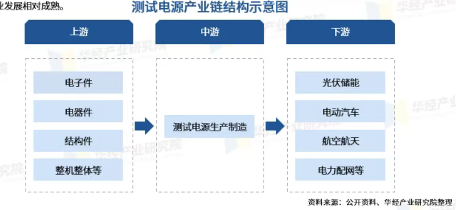 測試電源的上游原料主要包括電子件、電器件、結(jié)構(gòu)件、整機(jī)整體等,中游為精密測試電源設(shè)備制造,測試電源根據(jù)功率大小分為大功率和小功率。大功率測試電源產(chǎn)業(yè)化應(yīng)用發(fā)展時間相對較短,行業(yè)處于成長期,其主要應(yīng)用在新能源發(fā)電、新能源汽車、軌道交通、儲能系統(tǒng)等領(lǐng)域。小功率測試電源是工業(yè)領(lǐng)域的基礎(chǔ)測試設(shè)備之一,主要服務(wù)于航空航天、汽車電子、醫(yī)療設(shè)備、通信家電、消費(fèi)電子、電子元器件、新能源發(fā)電、新能源汽車等行業(yè),和下游行業(yè)的發(fā)展密切相關(guān),行業(yè)發(fā)展相對成熟。