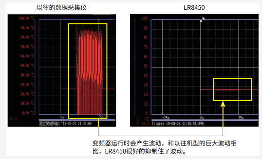 由于許多測試現(xiàn)場環(huán)境惡劣,對儀器的抗干擾性能要求較高。以前的機型在這種環(huán)境下進(jìn)行溫度測量的話,很容易受高頻影響發(fā)生測量值漂移、不穩(wěn)定的情況。所以日置針對此問題進(jìn)行了重新設(shè)計,大大減少了高頻噪聲的影響。非常適合測量變頻器、電池等周邊溫度的測量,下圖1為LR8450與以往機型的對比圖。