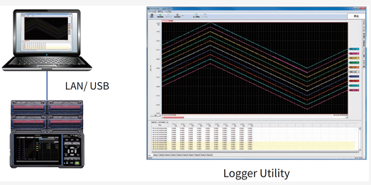使用標(biāo)配的應(yīng)用程序軟件Logger Utility,可實時在PC上記錄數(shù)據(jù),最多可同時控制USB或LAN通信連接的5臺數(shù)據(jù)采集儀。數(shù)據(jù)記錄期間,也可通過窗口底部滾動條查看歷史波形。實時測量的記錄間隔可從10ms開始設(shè)置。