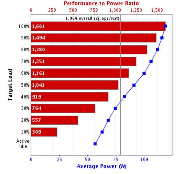 SPECpower?是由SPEC(標(biāo)準(zhǔn)性能評(píng)估組織)開(kāi)發(fā)的一種性能/功耗比基準(zhǔn)測(cè)試工具,是一套標(biāo)準(zhǔn)化的軟件測(cè)試腳本,通過(guò)模擬從100%滿載到活動(dòng)空閑(Active Idle)狀態(tài)共11個(gè)不同負(fù)載點(diǎn),來(lái)全面測(cè)量服務(wù)器的性能和功耗,最終計(jì)算出一個(gè)核心指標(biāo):ssj_ops/watt(每瓦特支持的業(yè)務(wù)處理量)。這個(gè)數(shù)值越高,服務(wù)器的能源效率就越高。也正因其權(quán)威性,目前國(guó)內(nèi)主流運(yùn)營(yíng)商在服務(wù)器集采招標(biāo)時(shí),都會(huì)要求提供基于SPECpower?的測(cè)試報(bào)告。圖2 基于SPECpower_ssj2008基準(zhǔn)測(cè)試結(jié)果- 紅色條 (性能功耗比): 代表每個(gè)負(fù)載點(diǎn)的效率,條形越長(zhǎng)、數(shù)值越高越好。