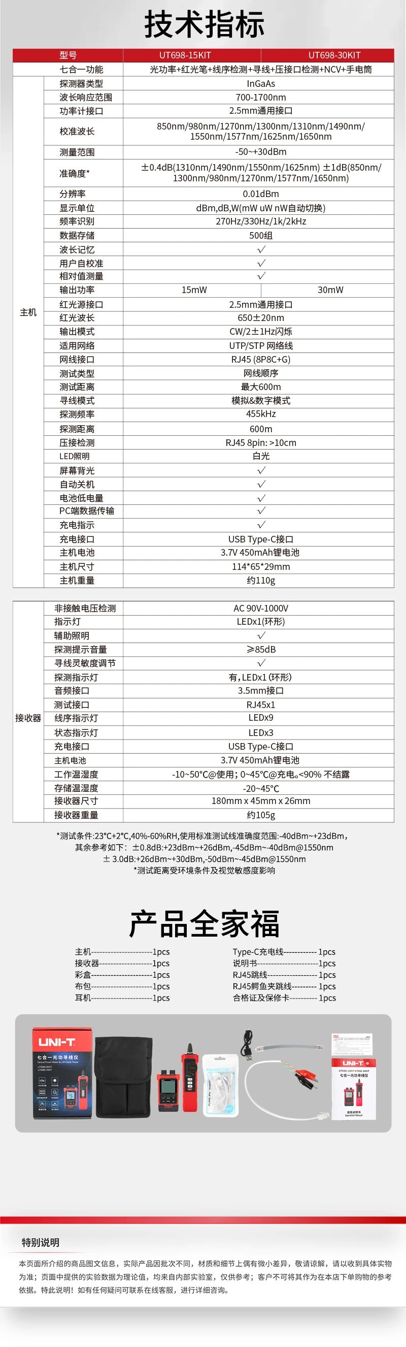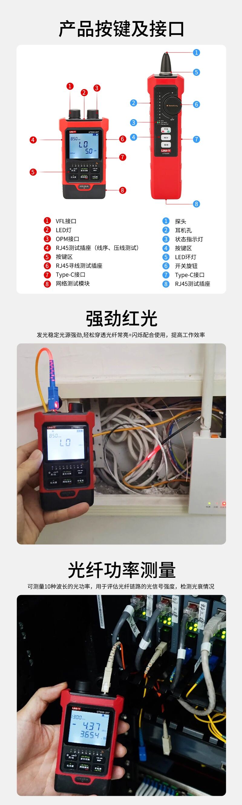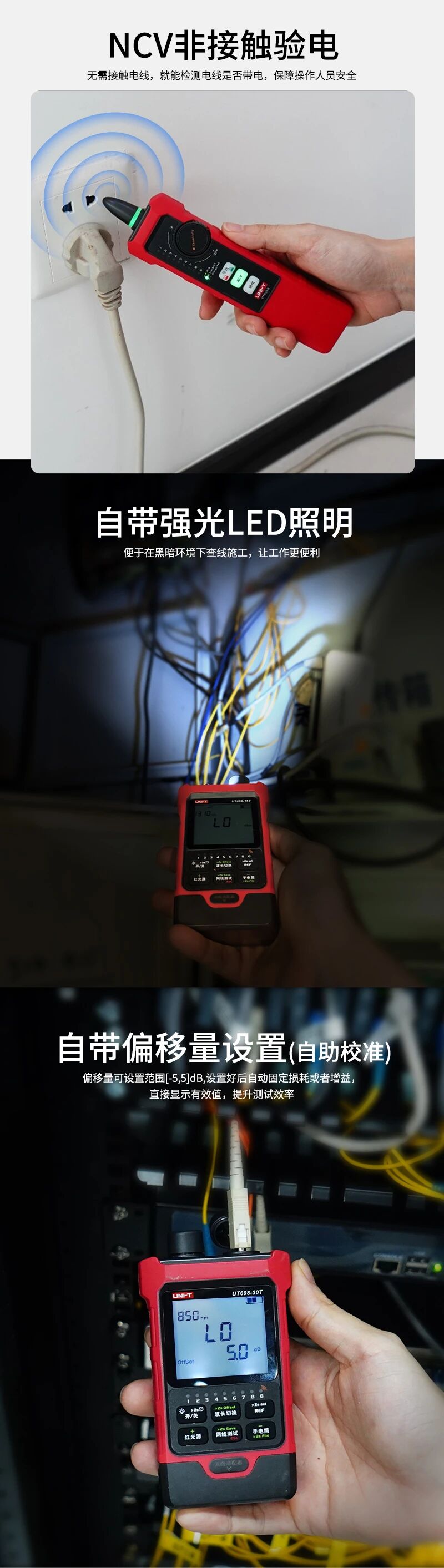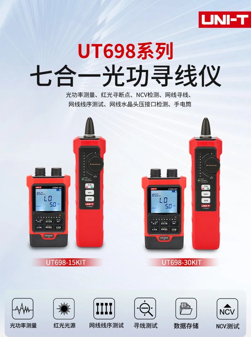 在現(xiàn)代通信與網(wǎng)絡(luò)維護(hù)工作中,工程師和技術(shù)人員往往需要攜帶多種工具,來應(yīng)對(duì)光纖與銅纜的安裝、調(diào)試及故障排查。優(yōu)利德推出的UT698系列七合一光功尋線儀,將光功率測(cè)量、紅光尋斷點(diǎn)、NCV檢測(cè)、網(wǎng)線尋線、網(wǎng)絡(luò)對(duì)線、水晶頭壓接檢測(cè)以及手電筒七大核心功能融合于一身,大大簡(jiǎn)化了現(xiàn)場(chǎng)操作流程,提升了工作效率,真正實(shí)現(xiàn)“一機(jī)在手,網(wǎng)絡(luò)無憂”。