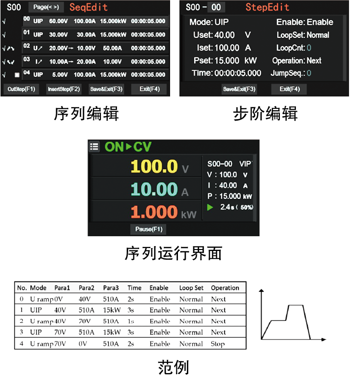 列表測試模式下,用戶可以設置一系列電壓或電壓變化值、電流或電流變化值、功率等級、操作模式、持續(xù)時間以及其他參數(shù)。該系列可按照定義的步驟自動輸出這些設定值,從而更好地支持自動測試、老化等應用場景。