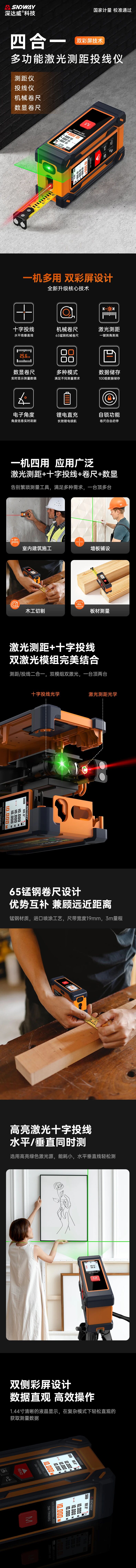 這款測距投線儀創(chuàng)新性地將激光測距、十字投線、數(shù)顯卷尺和機械卷尺四大功能融為一體,真正實現(xiàn)“一機四用”。用戶無需再攜帶多種測量工具,無論是在室內(nèi)裝修、板材測量,還是戶外施工中,都能輕松應(yīng)對各類測量任務(wù),極大提升了工作效率。