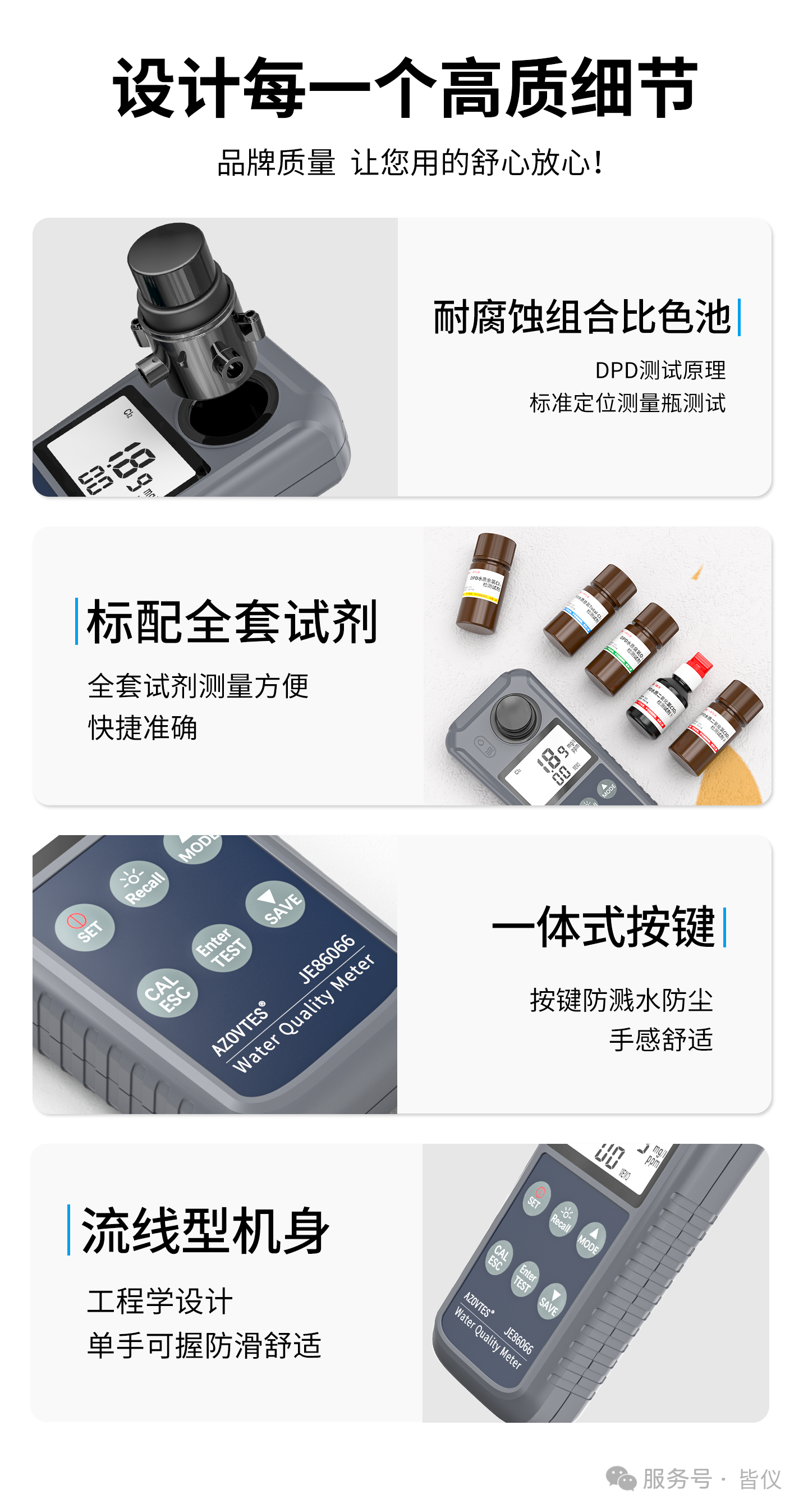 皆儀JE86066 多功能水質(zhì)檢測(cè)儀,采用先進(jìn)的DPD檢測(cè)原理,標(biāo)配全套試劑,實(shí)現(xiàn)即用即測(cè)、測(cè)量穩(wěn)定的專業(yè)檢測(cè)體驗(yàn)。