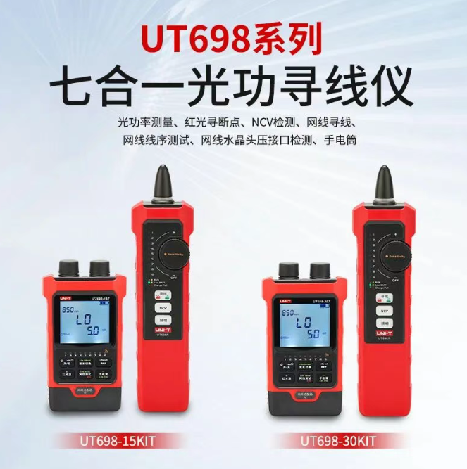 在現代通信與網絡維護工作中,工程師和技術人員往往需要攜帶多種工具,來應對光纖與銅纜的安裝、調試及故障排查。優(yōu)利德推出的UT698系列七合一光功尋線儀,將光功率測量、紅光尋斷點、NCV檢測、網線尋線、網絡對線、水晶頭壓接檢測以及手電筒七大核心功能融合于一身,大大簡化了現場操作流程,提升了工作效率,真正實現“一機在手,網絡無憂”。